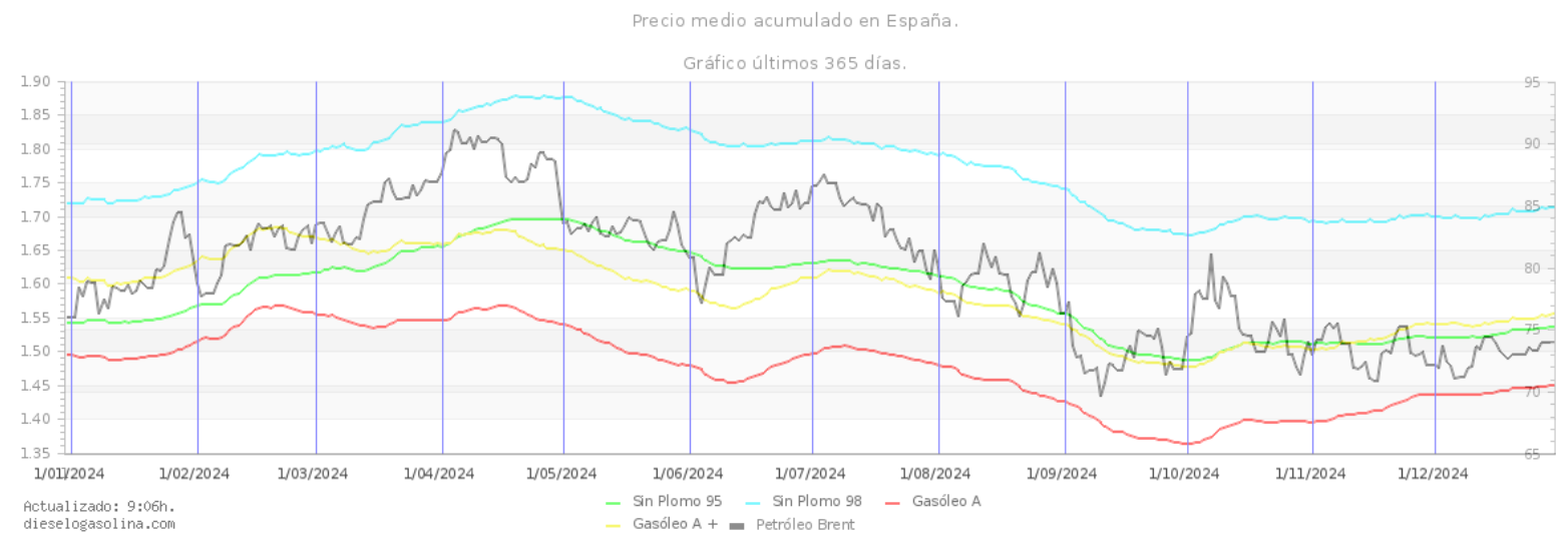 A lo largo de este 2024, los precios de la gasolina y el diésel han fluctuado bastante. Después de ver el gráfico elaborado por dieselogasolina.com, se aprecia que estos carburantes consiguen acabar el año con un precio más económico que aquel con el que lo empezaron. Por ejemplo, el litro de gasolina SP 95 costaba 1,55 euros y el del gasóleo A llegaba al 1,50.