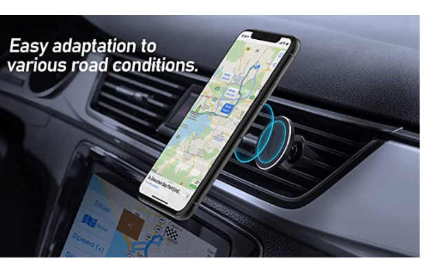 Este soporte para móvil marca Blukar se adhiere a la rejilla del aire, gira en 360 grados y tiene incorporados 5 bloques magnéticos N52. La imantación protege el dispositivo para que no se caiga y se puede estabilizar firmemente en varios ángulos. Cabe señalar que la fuerza magnética no afectará la señal del teléfono o GPS.