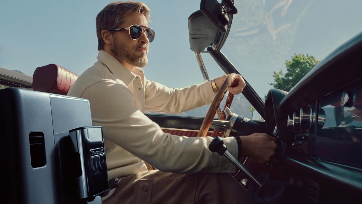 Lo hace después de preparar un café en la De’Longhi Rivelia. Una máquina de café, que ha convertido en su compañera de ruta: no en vano, es su copiloto a bordo del Alfa Romeo Duetto Spider de color azul marino que conduce el actor. Este modelo recoge el testigo del Lancia Flaminia GT Convertibile usado en otros anuncios de la misma marca.