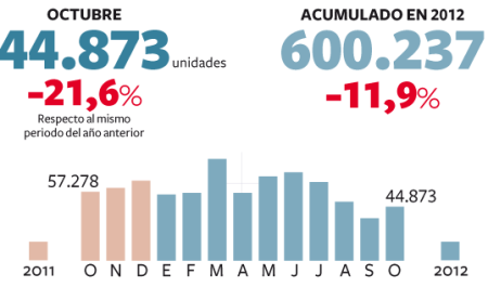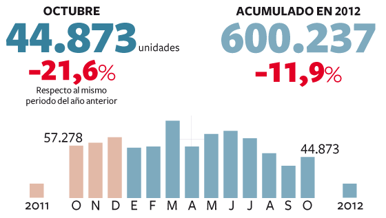 Un mes más las ventas de coches siguen bajando. El mercado se ha acostumbrado a los números rojos y se encuentra en niveles de hace dos décadas. Tan solo hace tres años se matricularon más del doble de unidades en octubre, 98.202 en 2009 frente a las 44.873 de este año. Sin embargo, parece que el Plan PIVE presentado por el Gobierno aliviará las maltrechas cifras de ventas de aquí a diciembre. En los ocho días hábiles desde que se presentó el plan, el 16 de octubre, más de 1.000 solicitudes diarias se han presentado en los concesionarios. Estas se harán efectivas en los próximos meses.