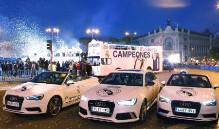 Tres automóviles Audi, un Audi RS 6 Avant y dos Audi A3 Cabrio, todos ellos de color blanco y decorados con el escudo del equipo, escoltaron al autobús que trasladó a los jugadores del Real Madrid en la celebración de la victoria en la UEFA Champions League 2013-2014 en su recorrido por las calles madrileñas hasta la Plaza de la Cibeles, donde los jugadores cumplieron con la tradición y celebraron el título ofreciendo la copa a los cientos de miles de aficionados que se dieron cita para recibir a su equipo.