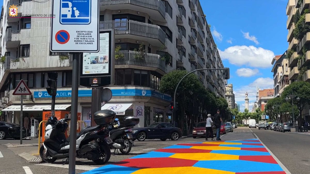 A esta lista de señales para pacificar el tráfico y proteger a los menores cuando van al colegio se ha sumado, con el curso ya acabado, el Ayuntamiento de León. El consistorio castellano ha anunciado las nuevas marcas viales, horizontales y verticales, que ya luce la calle de San Agustín en su cruce con la Gran Vía de San Marcos.