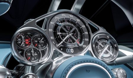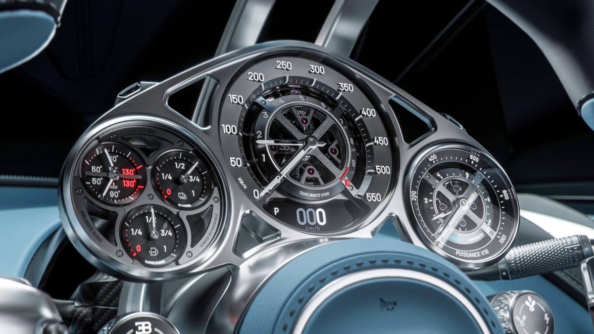 El velocímetro y el cuentarrevoluciones ocupan el dial central: cada uno tiene una aguja diferente emulando el mecanismo de un reloj y dejan al descubierto el centro para ver cómo funcionan todos los engranajes. A la derecha está el medidor de potencia del V16 y a la izquierda, los indicadores de temperatura, combustible y voltaje de la batería.