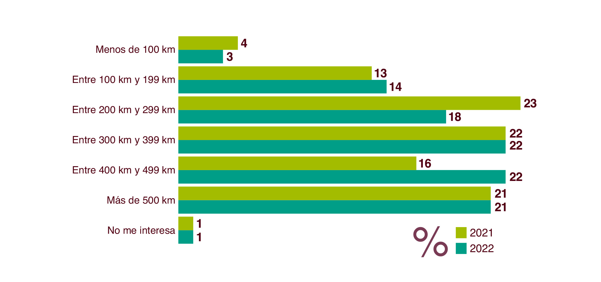 La autonomía es una de las dudas recurrentes en torno a los coches eléctricos. Solo una minoría (17%) se conforma con un alcance de menos de 200 kilómetros, y llama la atención que un porcentaje elevado (21%) pide a los eléctricos más de 500 kilómetros de rango de uso.