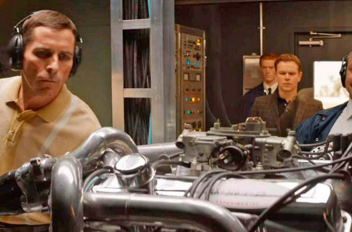 Ken Miles (interpretado por Christian Bale) trabaja en el motor del Ford GT ante la mirada de Carroll Shelby (Matt Damon).