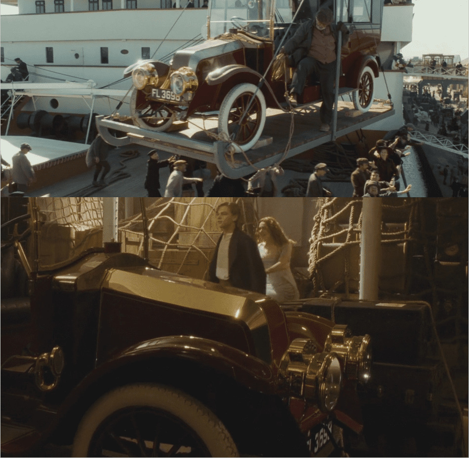 El modelo que aparece en la película es una réplica con detalles casi exactos al original, aunque este fue enviado protegido en el interior de una caja de transporte, como obligaban las normas de la compañía White Star Line. Por tanto, la escena romántica en el vehículo es ficticia, pues el coche viajaba a EE UU en la bodega especial para vehículos en un cofre especial de madera, como los otros probables automóviles transportados.