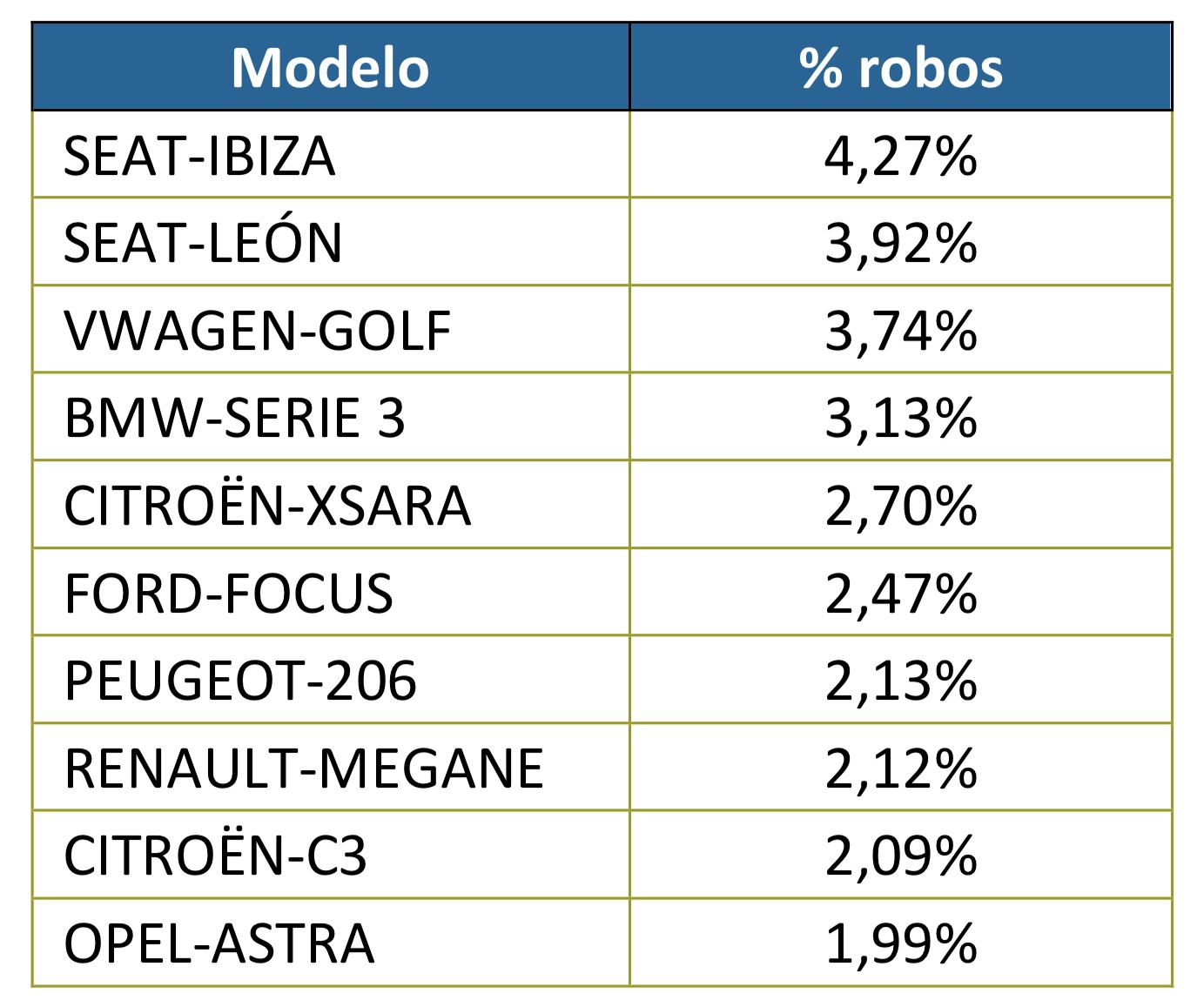 Las estadísticas que maneja Unespa también permite realizar una fotografía bastante fidedigna del tipo de coche más robado en España. Por lo general, se trata de unidades con más de diez años de antigüedad y principalmente modelos muy populares en las carreteras. Una realidad que las aseguradoras argumentan por la necesidad que existe de piezas de recambio para el mercado del vehículo usado antiguo, aliciente para quienes se dedican a esta actividad delictiva en el mercado negro.