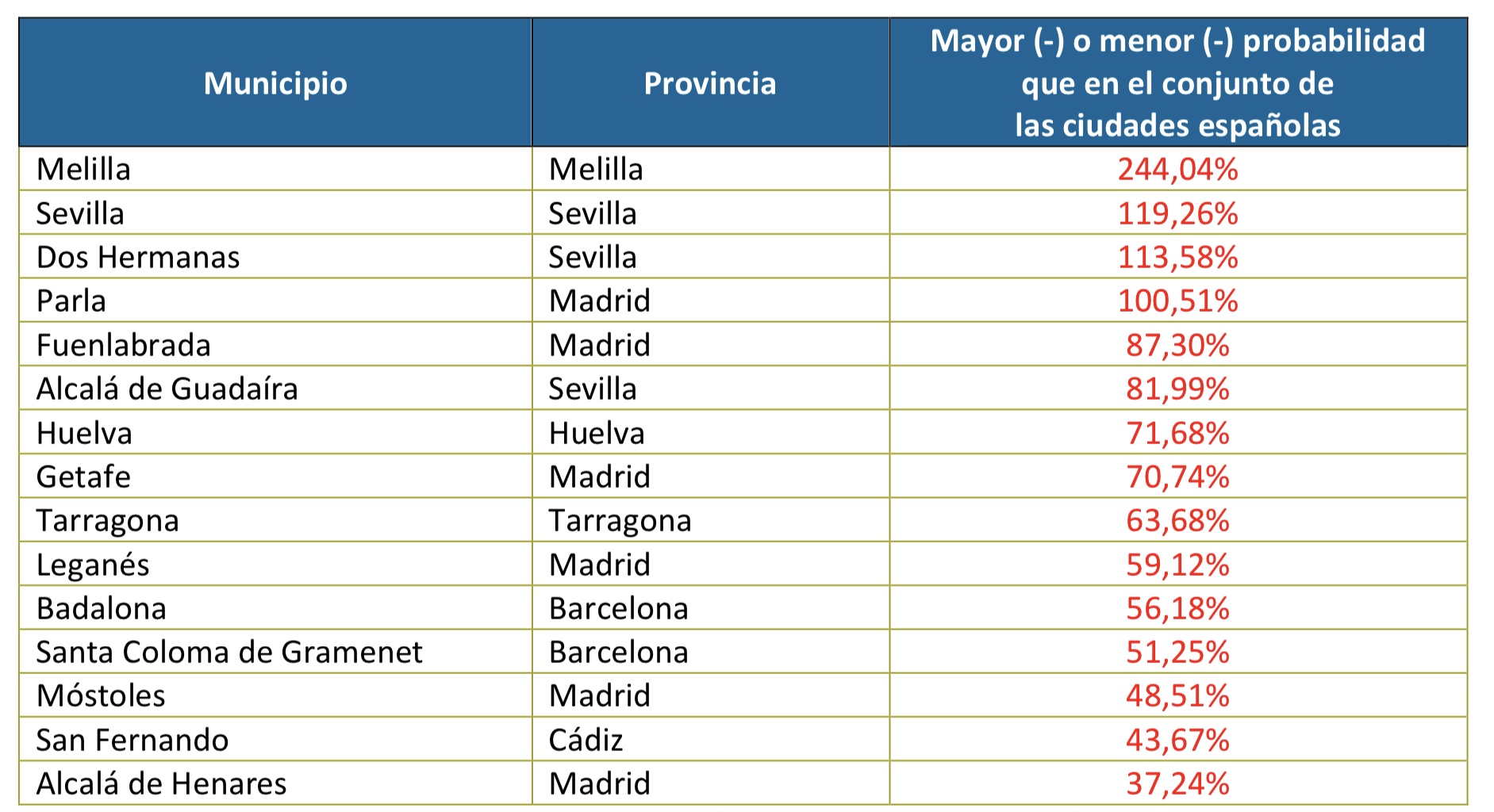 Unespa analiza del mismo modo las localidades que superan los 75.000 habitantes en las que son más frecuentes los robos de coches. Un dudoso privilegio que en 2018 correspondió a Melilla, por delante de Sevilla, Dos Hermana (Sevilla) y las madrileñas de Parla y Fuenlabrada. Se trata de ciudades en las que resulta dos y hasta tres veces más probable sufrir la sustracción de un coche que en el resto del país.