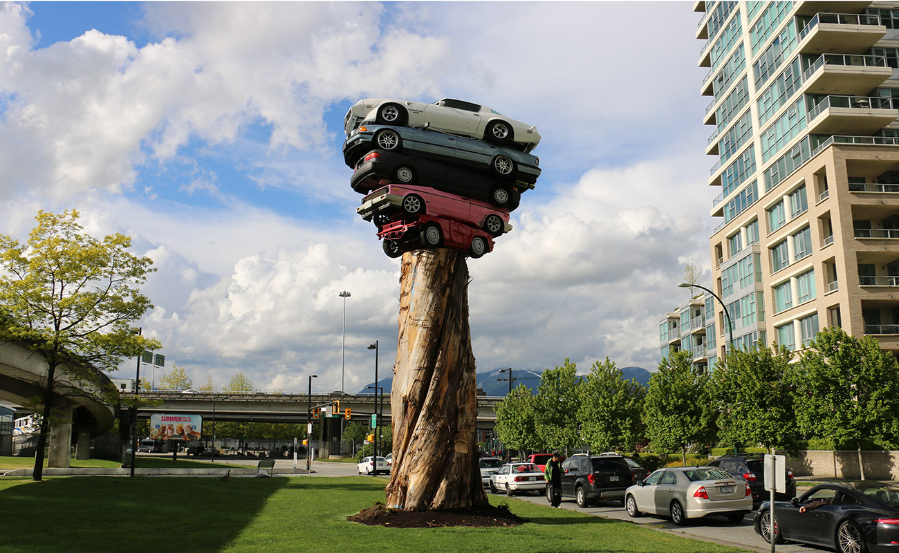 En Vancouver (Canadá), existe un enorme tronco de árbol que sujeta cinco coches apilados sobre su estructura. La escultura pesa en total 11.340 kilos y fue diseñada por el arquitecto Marcus Bowcott hace muy poco tiempo, ya que se inauguró en abril de 2015.