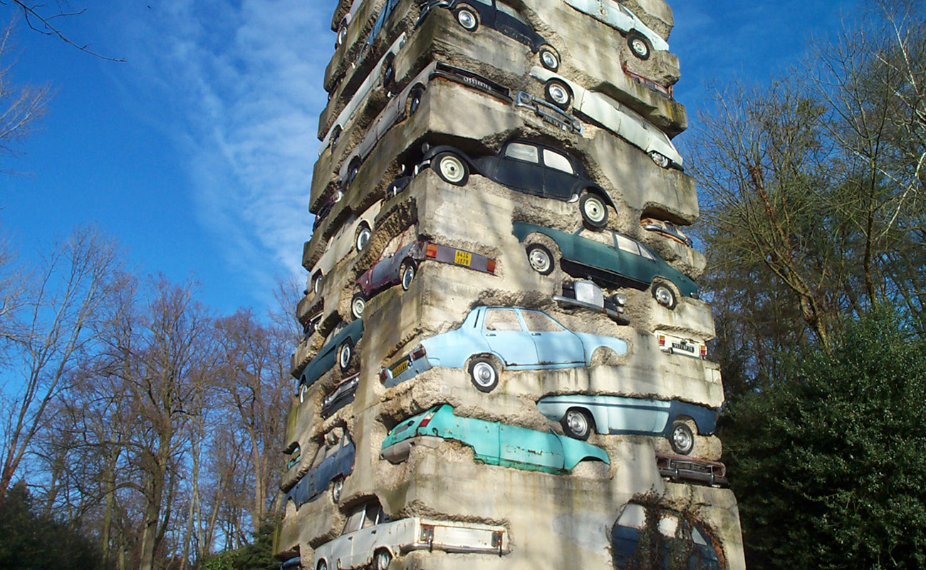 Pegadito a Versalles, en la comuna de Jouy-en-Jousas, se puede ver esta construcción diseñada por el artista francés Armand Fernandez. Un enorme bloque de 19,5 metros de alto acoge 59 coches, apilados unos encima de otros y fijados con 18 toneladas de hormigón.