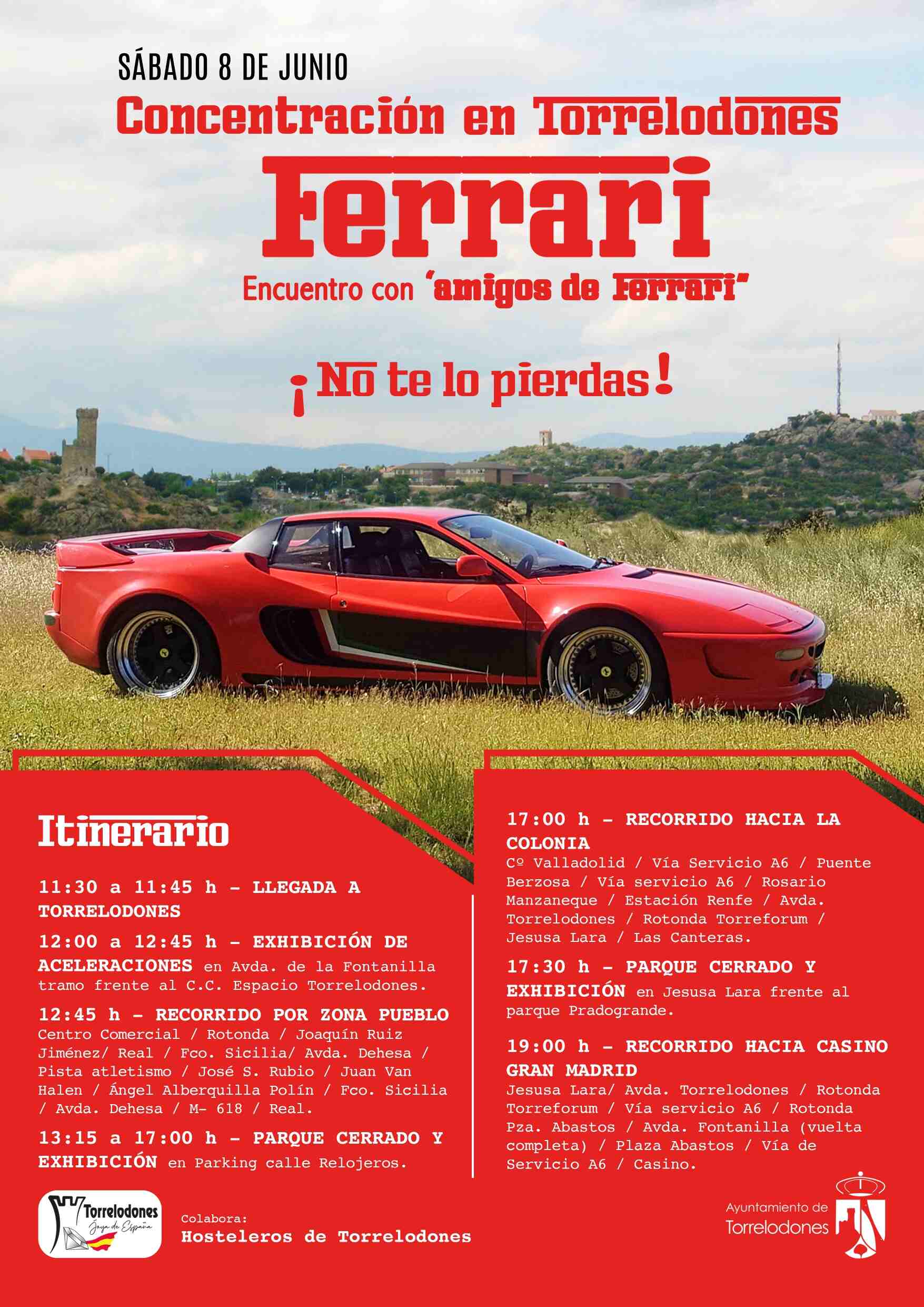 El público asistente podrá disfrutar de la potencia y el sonido de los motores de Ferrari, que posteriormente comenzarán su comitiva por las calles de Torrelodones. Pasarán por la rotonda del Dedo Gordo, saldrán a la M-618 y acabarán en la calle Real.