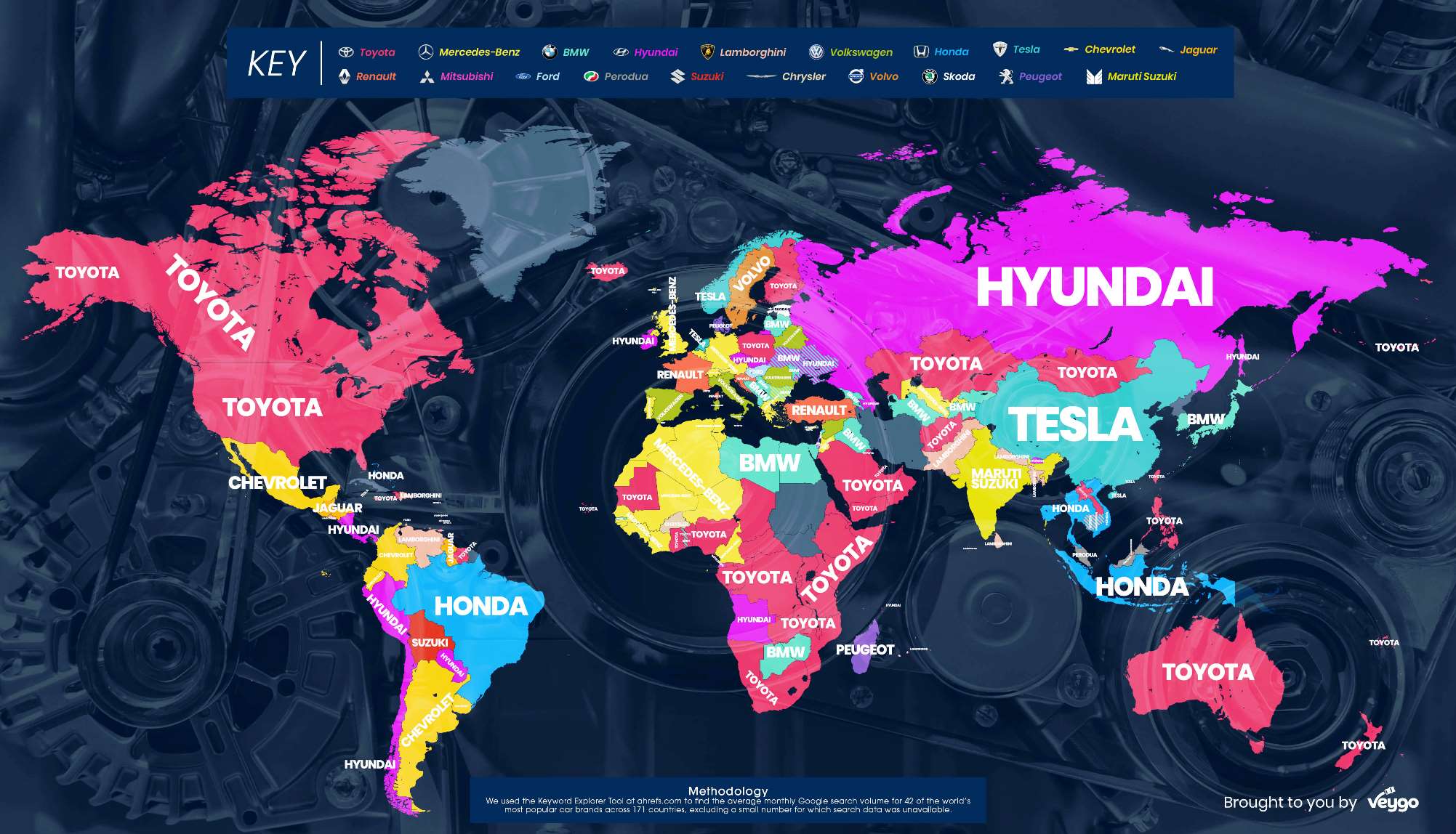 Tomando como referencia la herramienta de búsqueda de palabras claves, la compañía de seguros británica realizó un seguimiento de las 42 marcas más populares en 171 países del mundo. El resultado de este trabajo fue que la empresa de automoción más tecleada en el buscador de Google fue Toyota, con hegemonía en 51 mercados del total analizado. Un interés muy por encima del resto de sus competidores, ya que en la segunda posición figuró BMW, con 25 países, y Mercedes-Benz, con 23.
