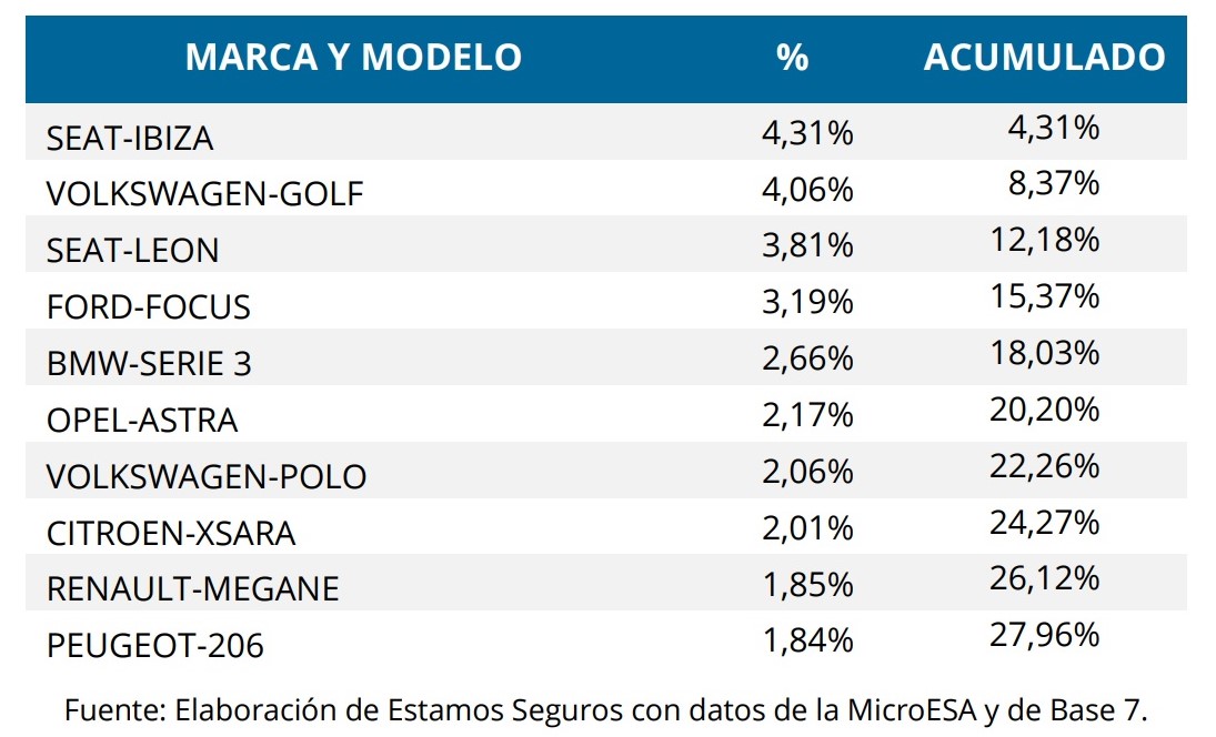 UNESPA también ofrece una información detallada sobre los modelos preferidos por los amigos de lo ajeno. La relación coincide, por lo general, con coches de una presencia destacable en el parque automovilístico español: cinco de ellos acumulan casi una quinta parte de todos los robos, entre un centenar de modelos recogidos.