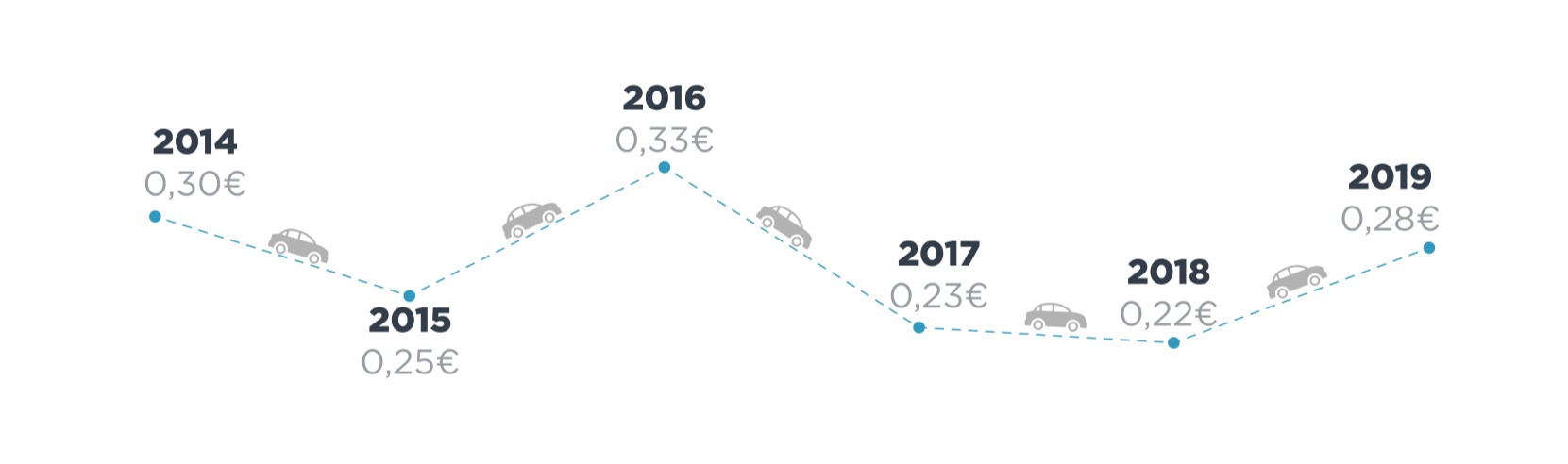 Sin embargo, quizá más relevante resulte saber que el precio medio del kilómetro durante el pasado año en España se fijó en 0,28 euros, lo que representa una subida de seis céntimos de euro respecto a 2018. Un ascenso que no ha sido constante a lo largo del tiempo, ya que en alguno ejercicios anteriores el precio del kilómetro fue muy inferior, hasta un mínimo de 0,22 euros en 2018.
