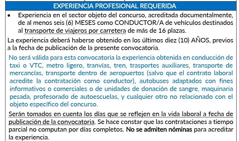 - Experiencia profesional de al menos seis meses como conductor de vehículos destinados al transporte de viajeros por carretera de más de 16 plazas.