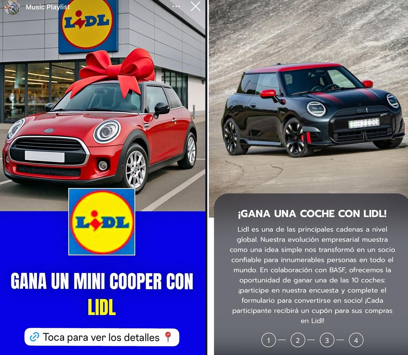 Hace unos meses, supuestos ciberdelincuentes usaron un vehículo como gancho para estafar a los usuarios, utilizando además el nombre de un conocido supermercado. “Lidl es una de las principales cadenas de descuento a nivel internacional. Nuestra historia muestra cómo una idea simple nos ha convertido en un socio confiable para muchas personas en todo el mundo. ¡Participa en nuestra encuesta y completa el formulario de nuestros socios para tener la oportunidad de ganar una de las 10 autocaravanas en colaboración con BASF! Cada participante recibirá un cupón para compras en LIDL”.