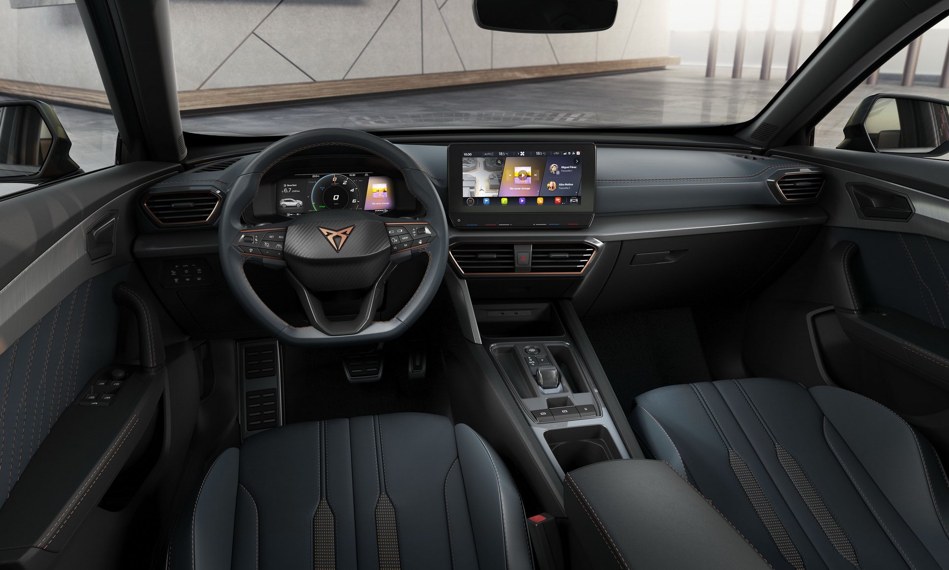 En el habitáculo se ha querido dejar claro que la firma está por encima de su hermana Seat, utilizando toda la tecnología que ofrece esta, pero añadiendo un plus tanto de deportividad como de lujo, como dejan claro detalles como la tapicería de cuero de los asientos tipo baquet o las molduras acabadas en cobre, que ya parece el color identificativo de Cupra.