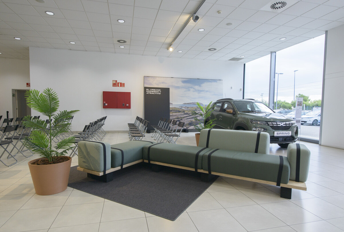 Y si los coches Dacia en su fabricación siguen unos planteamientos de ecorresponsabilidad, por ejemplo, prescindiendo de metales cromados en su decoración, los puntos de venta y salas de exposición de la marca hacen lo propio prescindiendo por completo del papel y amueblándolas con elementos reciclados. Todos ellos son fácilmente desmontables y están fabricados con materiales aprovechados de la propia industria, como los neumáticos usados.