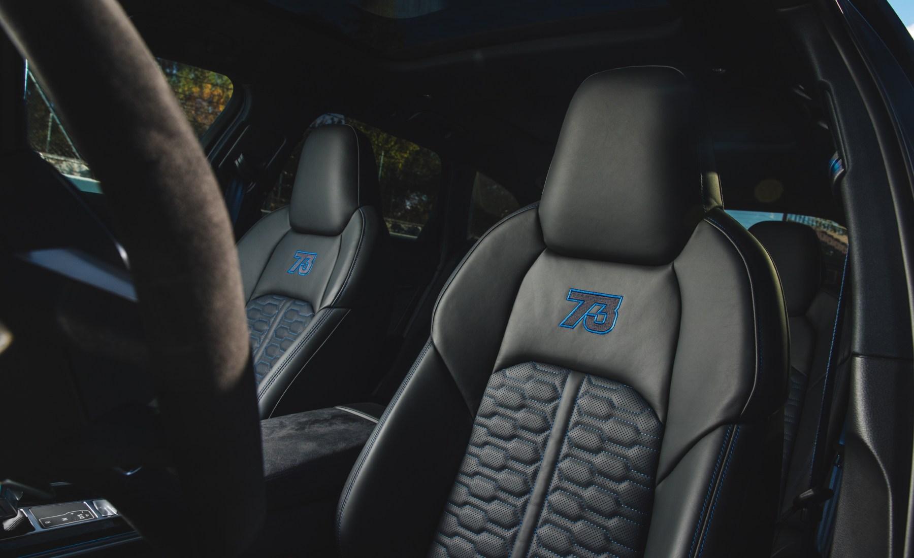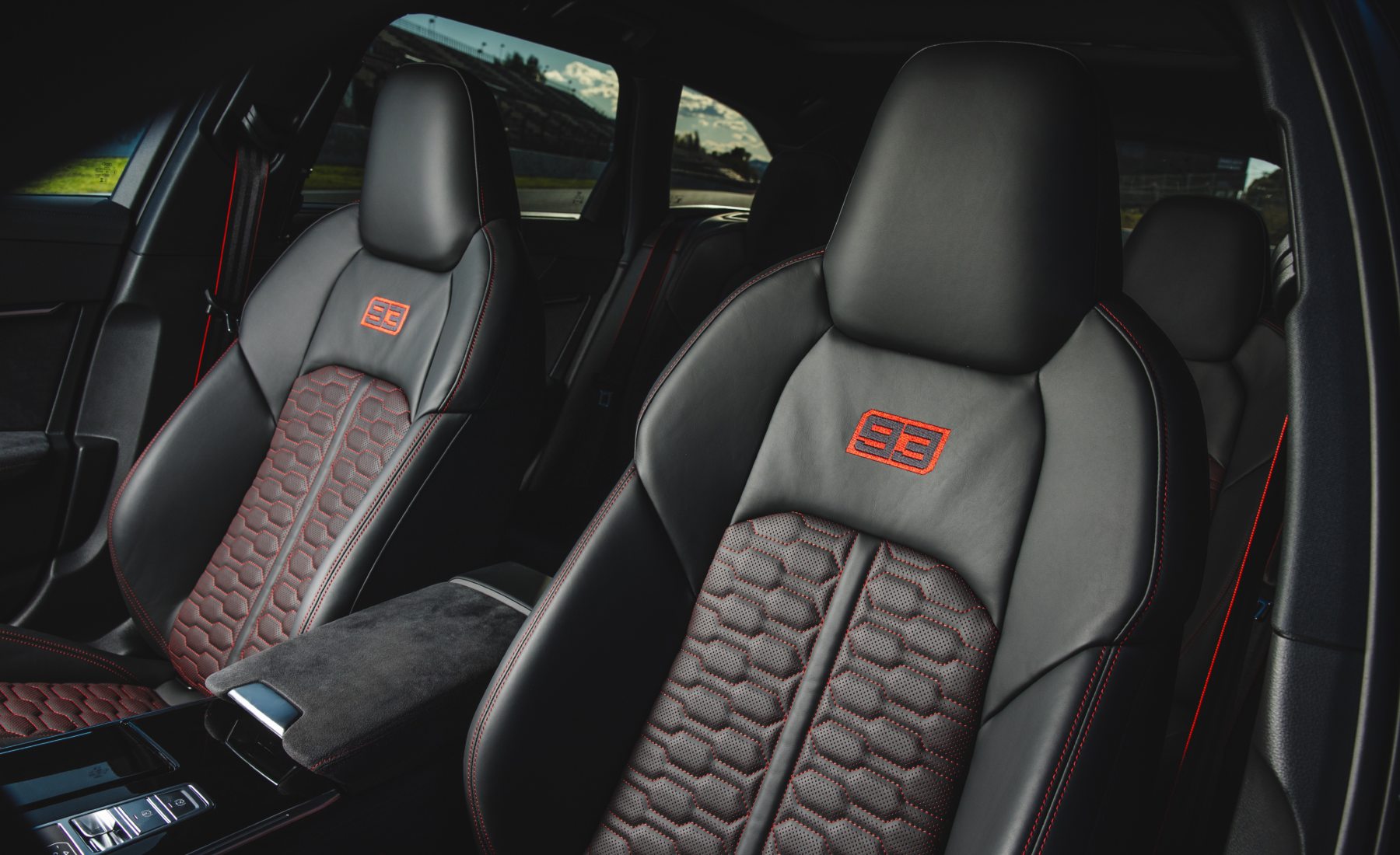 La exclusividad es aún más palpable en el interior, donde se rinde homenaje a sus logros y sus números de competición. En los umbrales de las puertas, las inserciones iluminadas lucen las leyendas ‘AUDI SPORT X MM 93’ y ‘ AUDI SPORT X AM 73 ’. La personalización culmina en los respaldos de los asientos, que sustituyen el logo RS bordado por el número de cada piloto, manteniendo la asociación cromática: rojo para Marc y azul para Álex. Esta misma asociación de colores se repite en las costuras de contraste de la tapicería y en los cinturones de seguridad de cada vehículo.