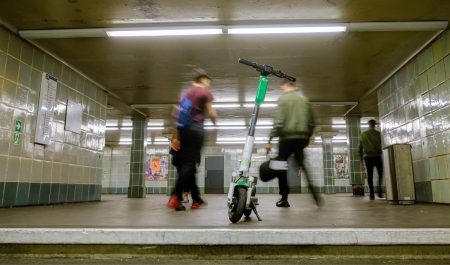 Un patinete eléctrico, en el interior de una estación de metro.