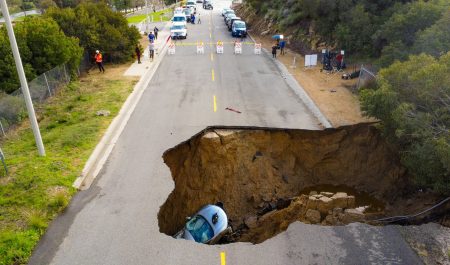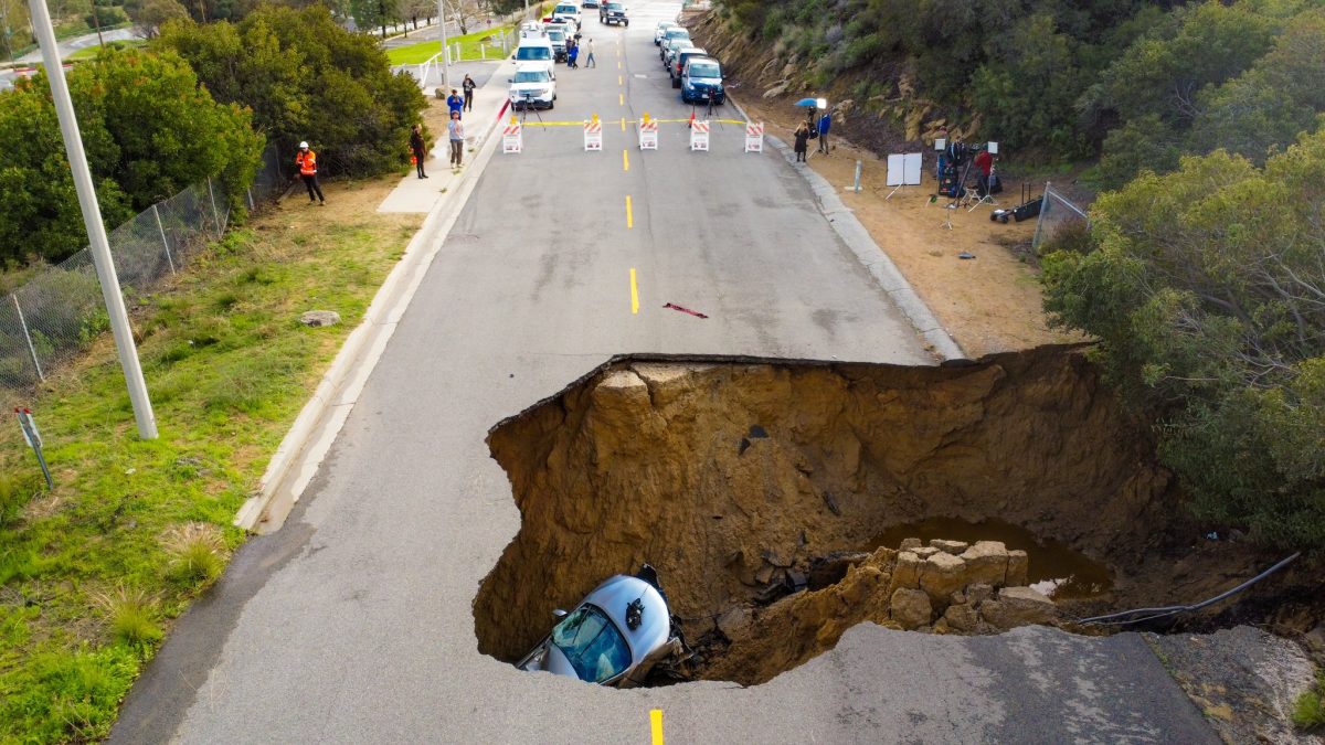 Los drones han podido captar algunas imágenes del enorme agujero que han provocado estas lluvias, situado en Chatsworth, un distrito ubicado en Los Ángeles.