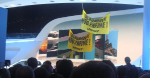 Era una de las novedades más esperadas del Salón del Automóvil de París 2012 que hoy se ha inaugurado: el nuevo Volkswagen Golf, la séptima generación de este icono de la industria alemana. Y no defraudó, tanto por el coche como por la irrupción de los ecologistas de Greenpeace en el acto de presentación. Descolgaron una pancarta desde el techo en la que criticaban a la industria del automóvil, mientras el presentador del evento seguía con su trabajo.