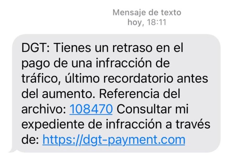 El texto avisa de un “retraso en el pago de una infracción de tráfico”. La primera trampa del texto es un supuesto número de expediente sobre el que interpelado puede pulsar. No encontrará en él ninguna información válida de la DGT, sino –con toda seguridad– un enlace malicioso diseñado para que los autores de la estafa logren infiltrarse en el dispositivo.