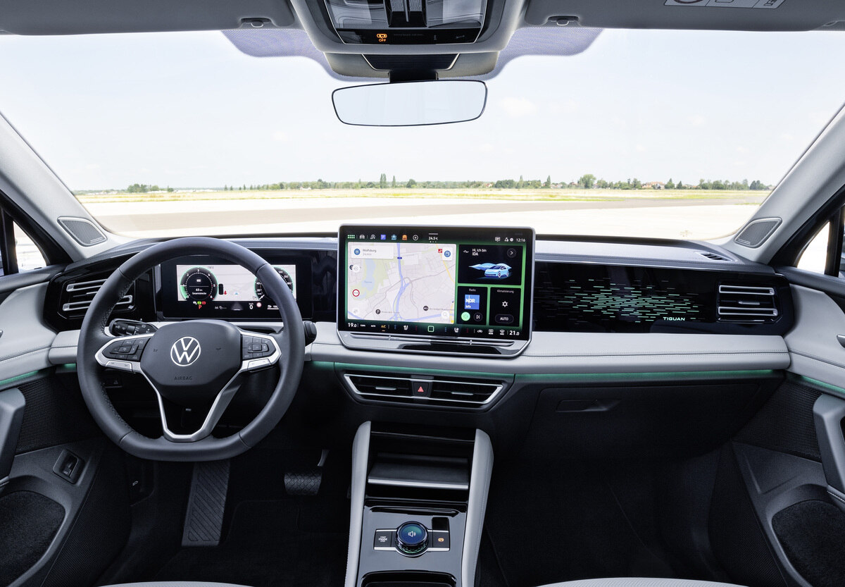 Una de las ventajas aportadas por la plataforma MQB Evo es que el Tiguan 2024 ha podido incorporar un nuevo software, cuya tecnología ha permitido renovar todo el equipo de instrumentación y multimedia. El panel tras el volante (10,25 pulgadas) es completamente digital y puede completarse opcionalmente con un sistema de proyección de los datos en el parabrisas. Por su lado, la pantalla central multifunción está ahora en una posición más elevada y según el nivel de acabado puede ser de dos tamaños (12,9 o 15 pulgadas).