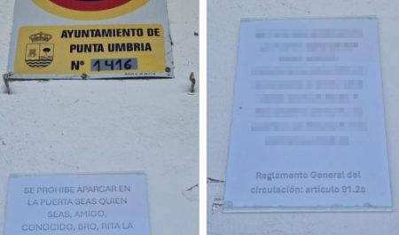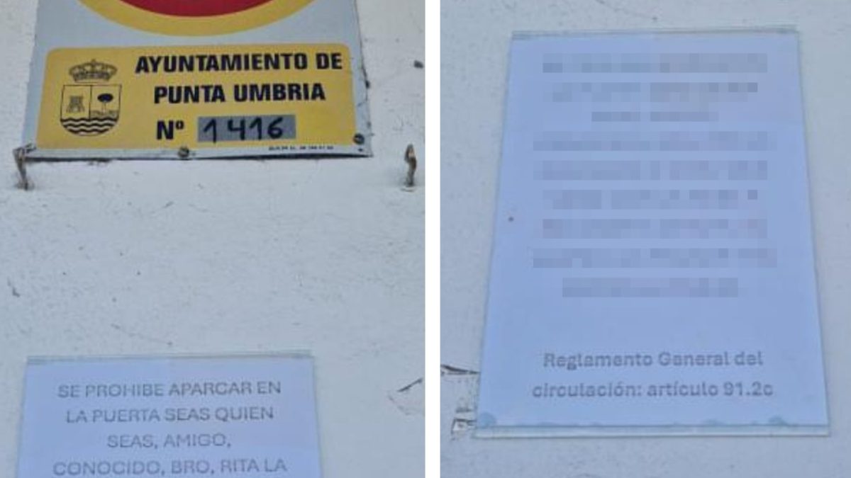 La siguiente imagen se trata de un cartel pegado en una pared en Huelva (Ayuntamiento de Punta Umbría) que reza: “Se prohíbe aparcar en la puerta, seas quien seas: amigo, bro, Rita la Cantaora, o Goku que viene con la nube a recoger a Chichi. Se llama a la policía y te comes la multa”.