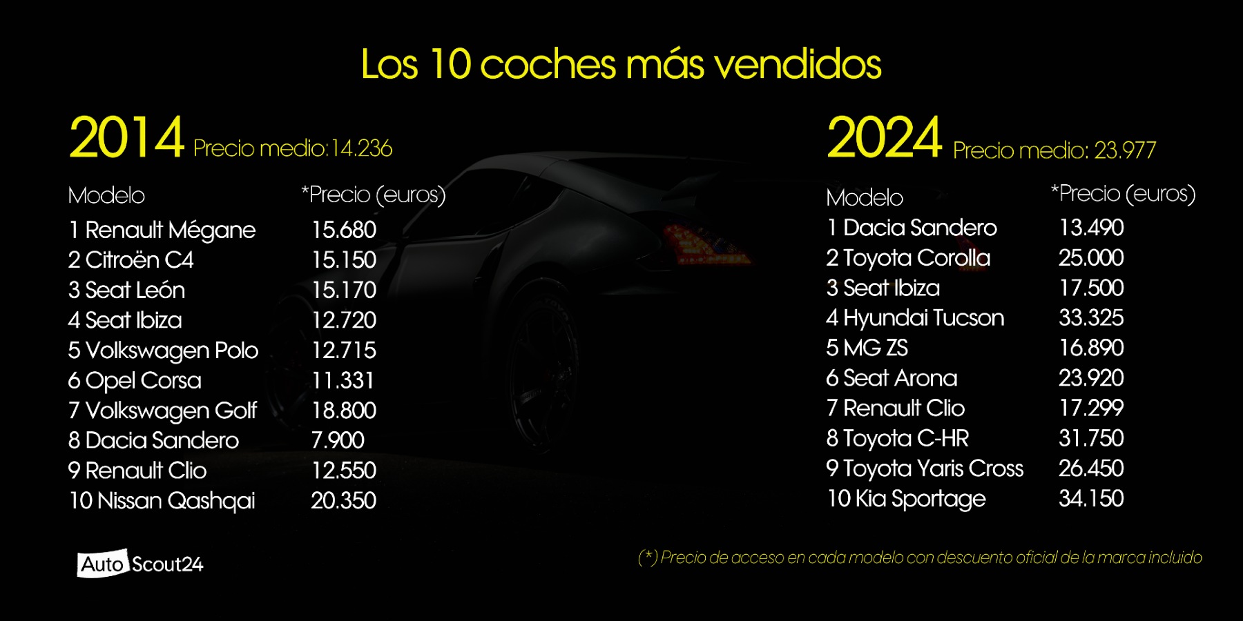 En la última década, el precio medio de los 10 coches más vendidos en España ha experimentado un incremento del 68%, según el informe de AutoScout24 (plataforma líder en Europa en la compra-venta de coches usados). De los 14.236 euros de media en 2014, se han pasado a 23.977 euros en 2024. Este aumento supera ampliamente al IPC acumulado en el mismo periodo, que apenas alcanzó un 19,4%.