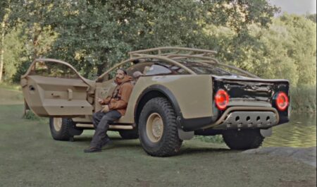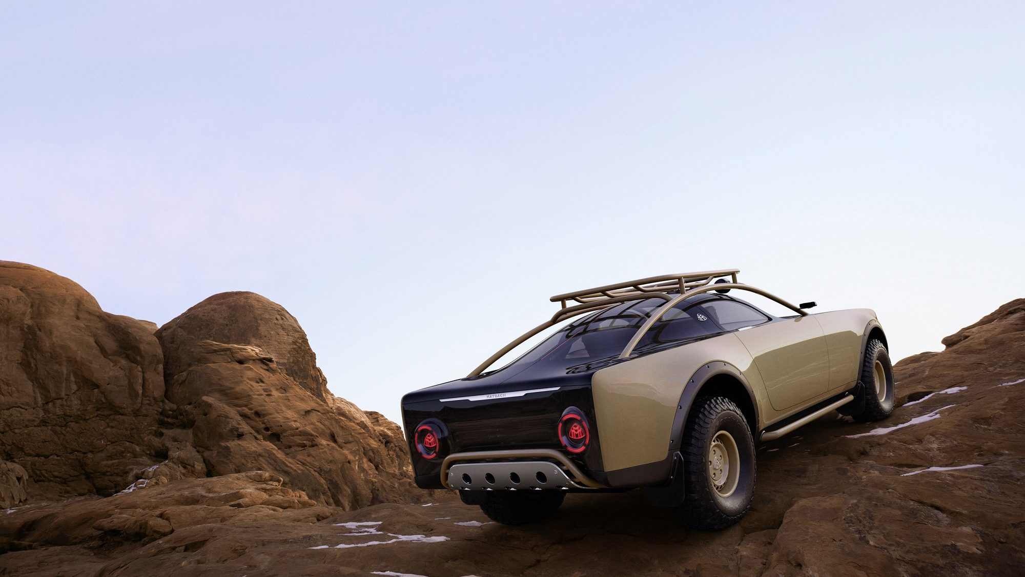 Estéticamente, el coche combina el diseño de la vieja escuela (el capó largo y las líneas de la carrocería del cupé) con elementos todoterreno (una jaula antivuelco externa y enormes neumáticos) con un interior retro-futurista.