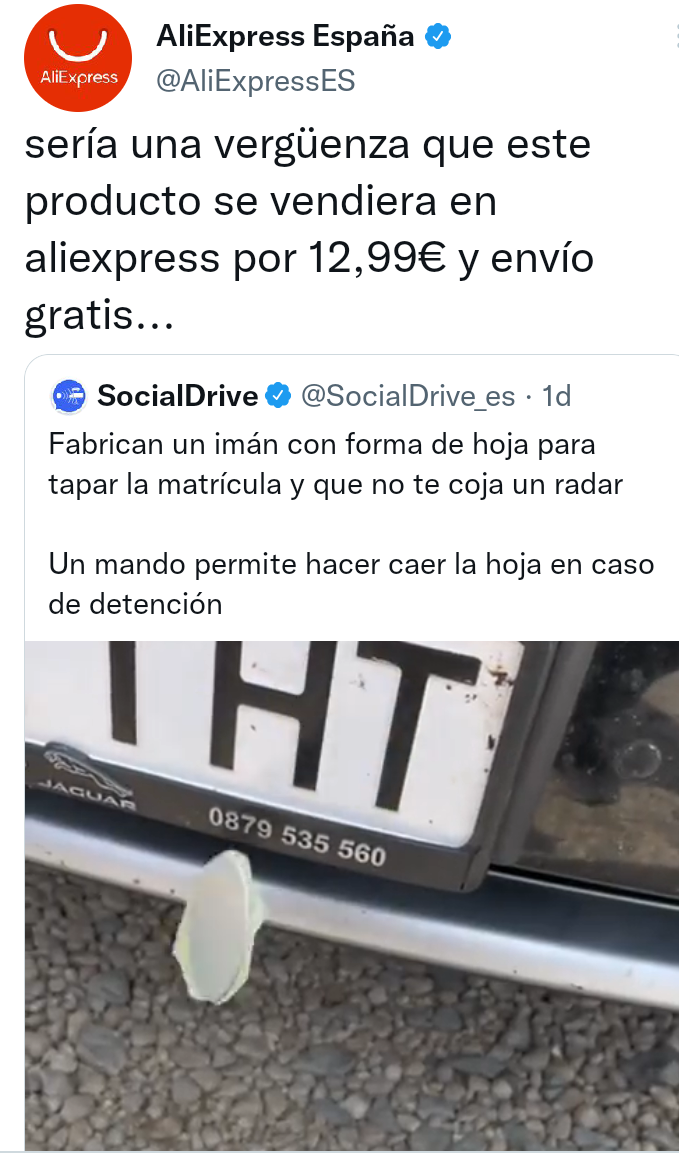 Incluso la cuenta de AliExpress en España se sumó a la conversación y dejó caer, como la hoja, que vende el producto. Ya ha retirado el tuit.