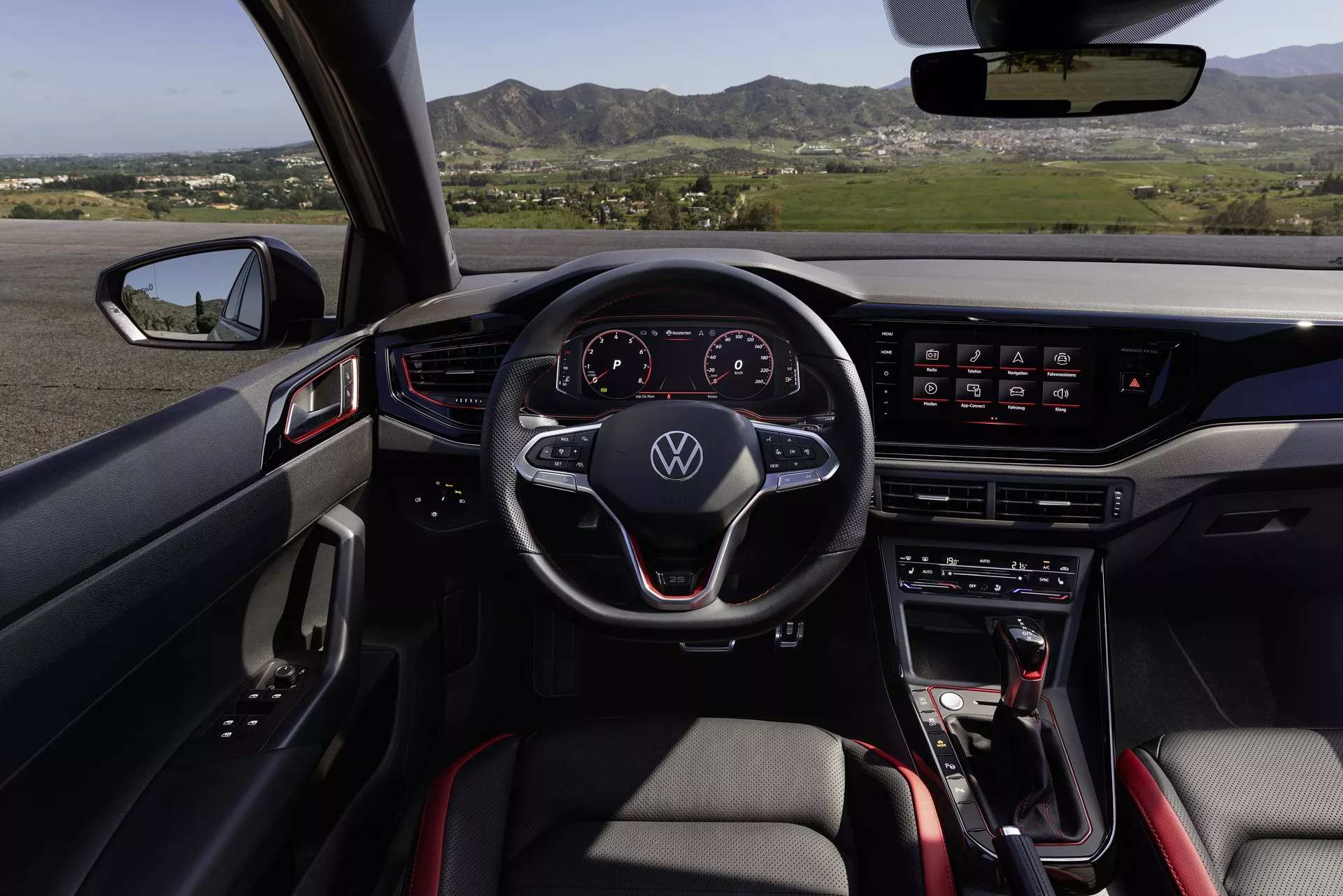 En el habitáculo, un 25 aparece en el volante deportivo multifunción y la tapicería de cuero combina los colores negro y rojo. Esta dupla también luce en el salpicadero y en los gráficos del cuadro de instrumentos y de la pantalla central. Esta es de ocho pulgadas, aunque puede reemplazarse por una mayor de manera opcional.