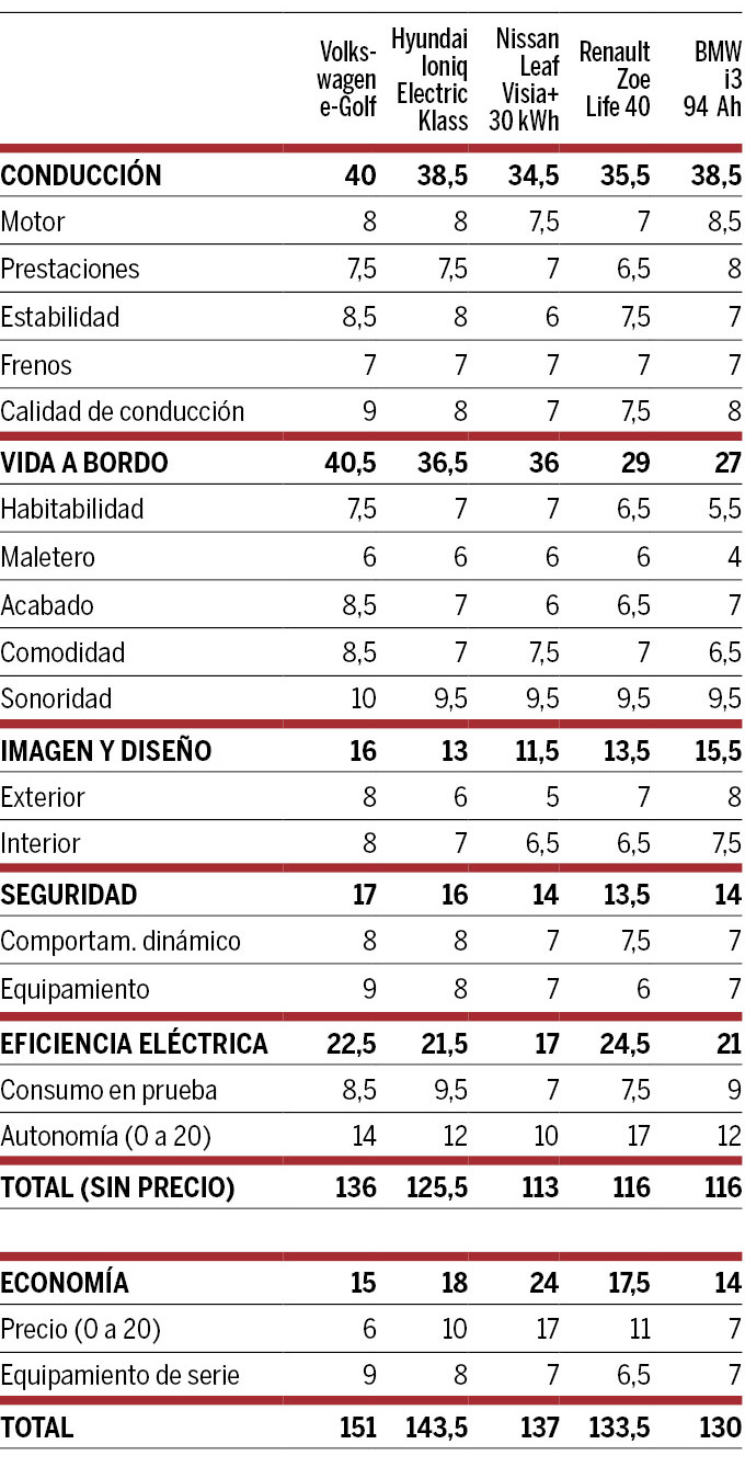 Pero es la consecuencia de una oferta de modelos a pilas todavía incipiente y sin suficientes alternativas equivalentes. Así, se impone el Volkswagen e-Golf, porque es el más completo como familiar. Pero si se valoran solo los aspectos específicos de los coches eléctricos, el mejor es el Renault Zoe, líder claro en autonomía.