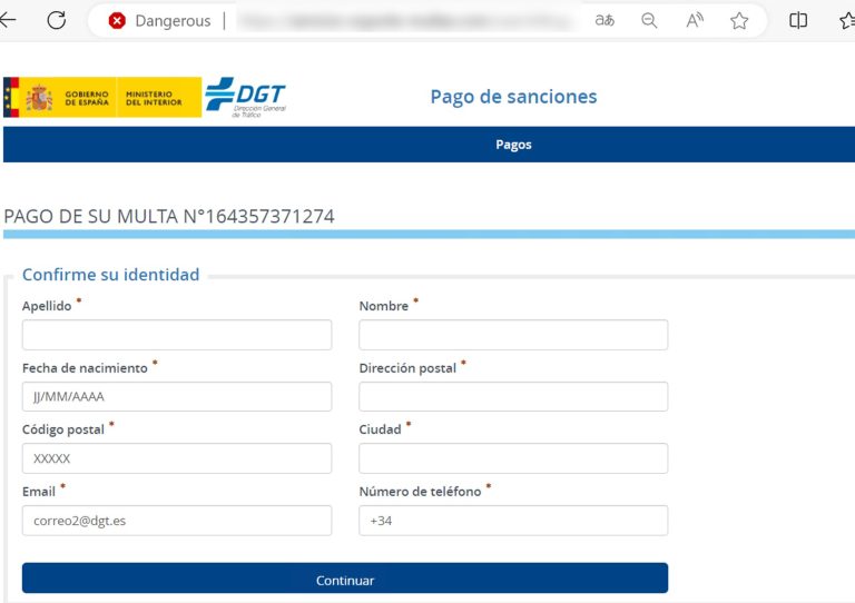 Las páginas que han revisado los expertos en ciberseguridad muestran una apariencia similar a la web de la DGT, pero con mensajes que deberían hacer sospechar, como el amenazante “tiene menos de 24 horas para pagar la multa”.