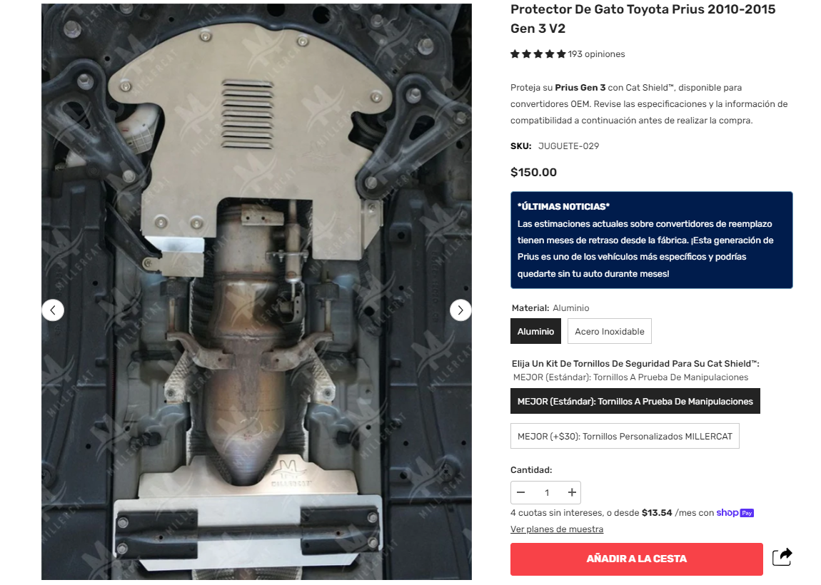 No es difícil encontrar en internet protectores para la pieza tan codiciada de este modelo de Toyota. La empresa especialiazda Catshield, por ejemplo, vende una placa de protección que tiene un precio de 150 euros y se caracteriza por ser un elemento para que los ladrones lo tengan bastante más difícil.