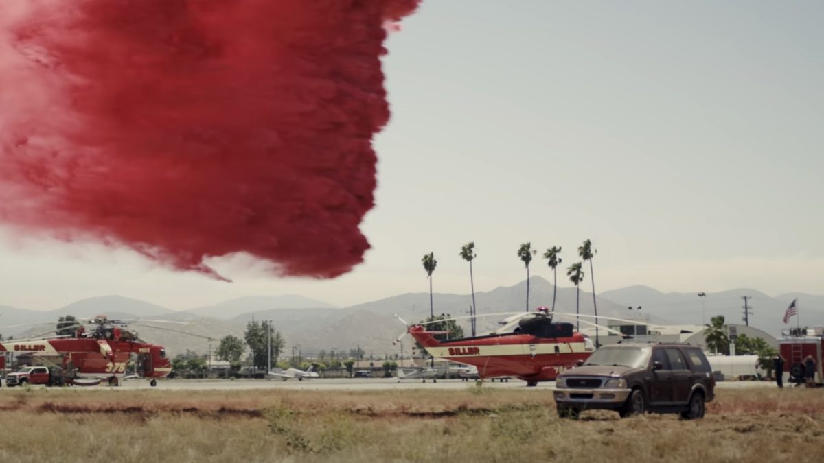 Lo que se muestra, más o menos a partir del primer minuto, es un modelo Grumman S-2 dejando caer su carga sobre SUV de Ford, concretamente un Expedition, que no es que sea precisamente pequeño.