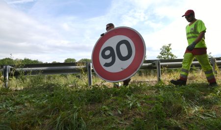 Operarios en Francia con una señal de tráfico. Allí se ha reducido el límite a 80 km/h.