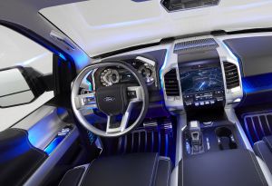 El Ford Atlas Concept incluye una trampilla posterior que se puede extender para transportar objetos extra largos, asistente para remolque, cámara de visión trasera, iluminación con tecnología led y rampas de acceso a la caja de carga plegables.