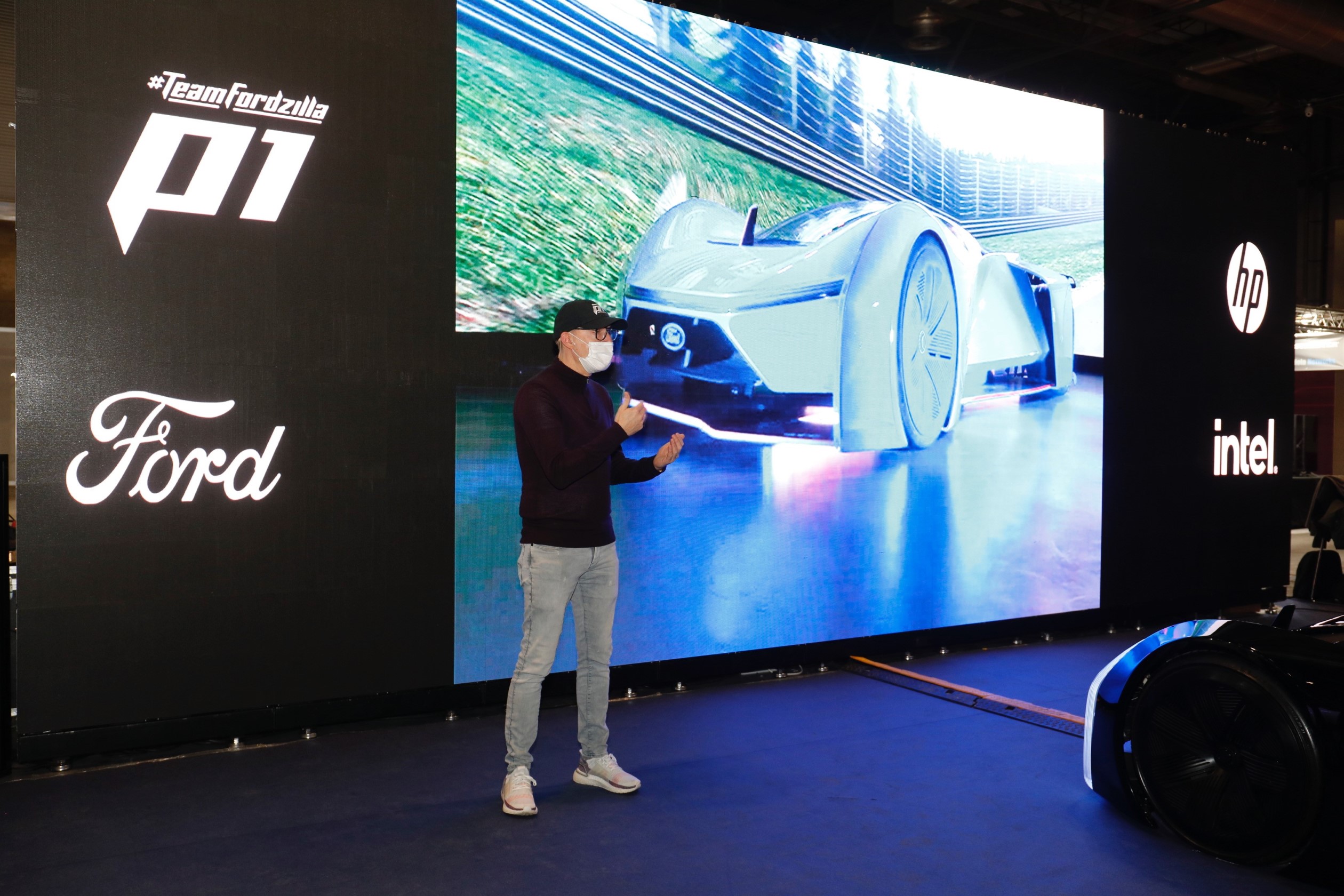 El coche se combina con una pantalla enorme de alta resolución (10 x 4 metros), y con dos equipos vanguardistas de la empresa HP, socio de Ford en el desarrollo del P1, que añaden altas dosis de realismo.