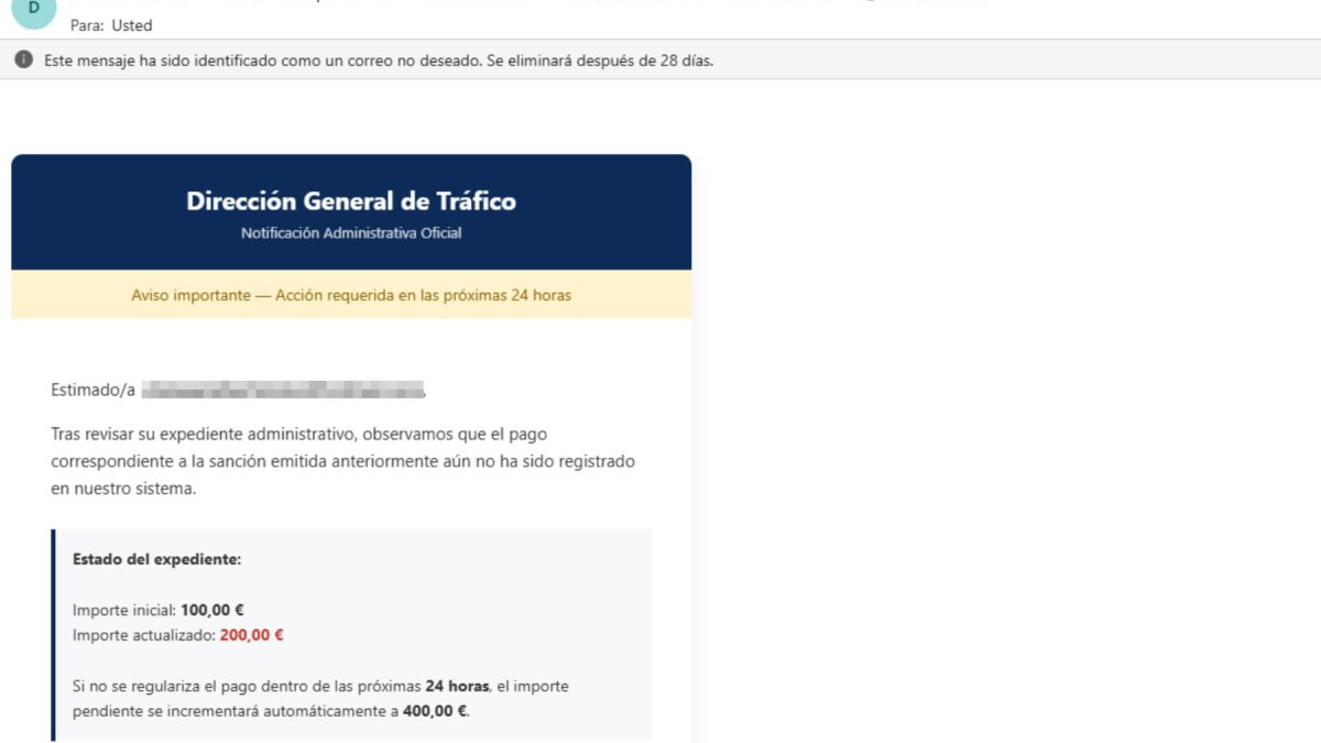 En primer lugar, no se dirigen a mí por mi nombre: usan la dirección de correo electrónico. A continuación, me explican que no han recibido el pago de una hipotética multa: “Tras revisar su expediente administrativo, observamos que el pago correspondiente a la sanción emitida anteriormente aún no ha sido registrado en nuestro sistema”.