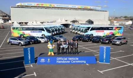 A falta de nueve días de dar comienzo la próxima Copa del Mundo de Fútbol de Brasil 2014, Hyunda ha hecho entrega al comité organizador de la Copa del Mundo de la flota de vehículos y autobuses para el transporte de los equipos nacionales, los miembros del comité organizador, árbitros y representantes de los medios durante todo el torneo. Asimismo ha desvelado la decoración de los 32 autobuses que transportarán a las diferentes selecciones nacionales. Los modelos entregados son Equus, Génesis, Azera, Santa Fe, Sonata, Tucson (ix35), Veloster, H1, H100 y el modelo exclusivo de Brasil, el HB20.