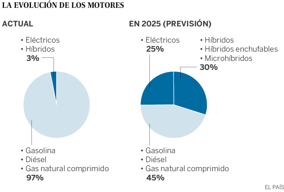 Las previsiones indican que en 2025 el 25% de los modelos vendidos en Europa serán eléctricos (un 3% hoy), y otro 30% híbridos, sumando enchufables, normales y los nuevos microhíbridos. Un escenario que dejará, todavía, un 45% del mercado a la gasolina, el gasóleo y el gas natural, y que materializa la obligación de continuar puliendo los propulsores térmicos.