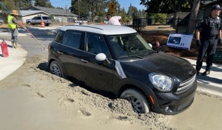 El Mini Cooper robado y atascado en cemento fresco. | Ayuntamiento de Lakewood.