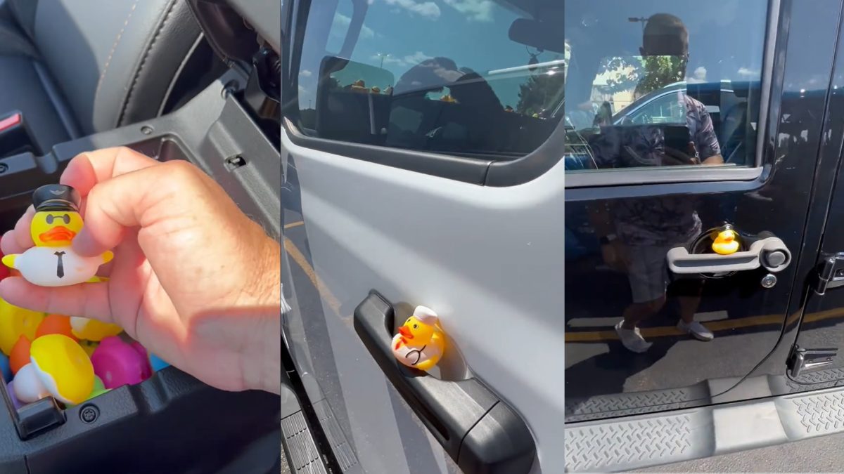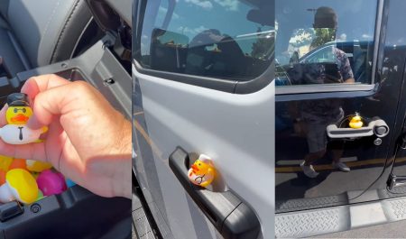 La mujer tenía una bolsa con pequeñitos patos de goma y dejó uno en el coche con un mensaje: Cool Jeep. Lo dejó en la puerta del vehículo y luego decidió fotografiarlo para recordar el detalle.