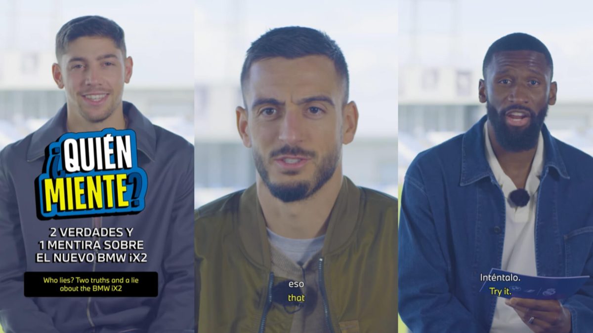 En un vídeo publicado por BMW en sus redes sociales, son Valverde, Joselu y Rüdiger los encargados de examinar al público. Para ello, proponen a los aficionados adivinar quién de los tres está mintiendo acerca del equipamiento del BMW iX2.