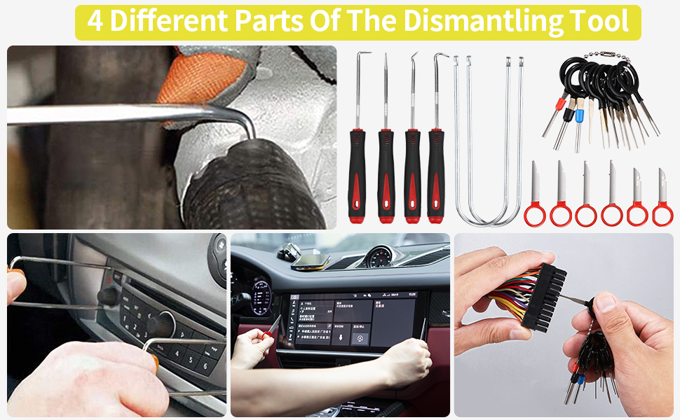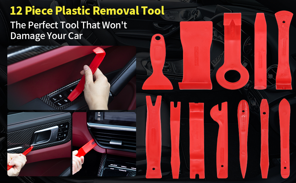 Las 12 herramientas de desmontaje son adecuadas para todo tipo de modificaciones en el coche, incluido el desmontaje del interior, el desmontaje del salpicadero o el desmontaje de la zona de control de audio. También sirve para el desmontaje del extractor de cables del clip del coche, los paneles de las puertas, los listones, los paneles de las ventanillas, los clips, las sujeciones y otras piezas.
