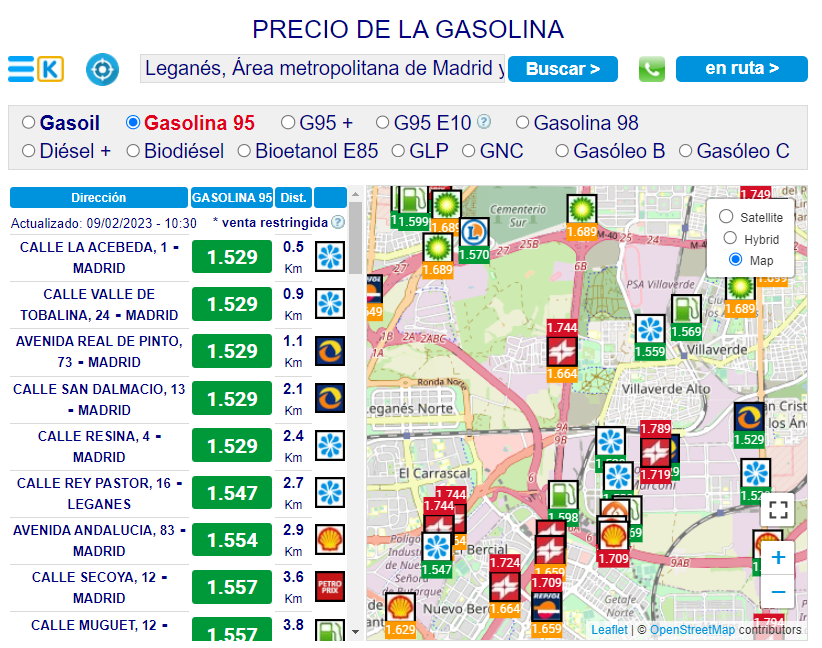 Los resultados en cuanto a opciones serán numerosos. En el ejemplo anterior, hay más de 20 gasolineras encontradas en Leganés (Madrid). Todas ellas estarán ordenadas desde los precios más bajos (de color verde) hasta las que tengan valores más costosos (rojas).