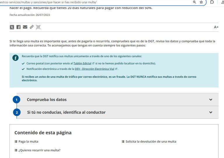 De hecho, la web fraudulenta replica parte de un artículo de la DGT en el que el organismo resume el proceso de notificación y pago de una sanción. “Recuerda que la DGT notifica sus multas únicamente a través de uno de los siguientes canales”, dice el texto real. En la web modificada no aparecen esa información, sino avisos falsos y un ultimátum.
