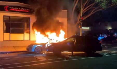 En un momento dado, varios individuos destrozaron el parabrisas de un Nissan 370Z robado y posteriormente lo quemaron de forma intencionada. Acto seguido, un Subaru Outback chocó de forma repetida contra el Nissan. Ambos vehículos quedaron destrozados antes de terminar en llamas.